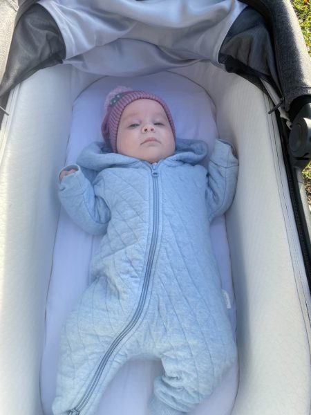 Baby Grace in a blue pram nap suit!